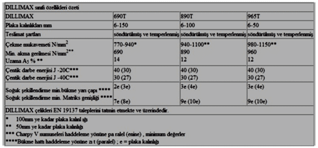 DILLIMAX'a ilaveten iki ayrı çelik cinsini size tavsiye ederiz. DILLIMAX 890 ve DILLIMAX 965.Bunlar eksterem yüklenme durumları için geliştirilmiş çeliklerdir. Tüm bu çelik türlerinin özellikleri aşağıda özetlenmiştir. Bu sınıftaki diğer ürünler talep üzerine teslim edilebilir : DILLIMAX 460, 500, 550 ve 620